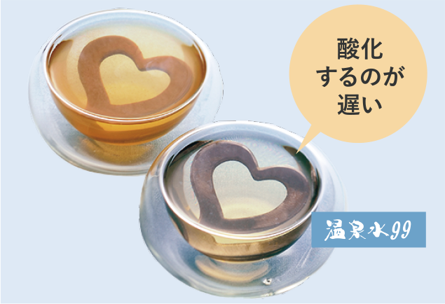 若々しく健康でいるために大切なのは、体内バランスの維持。 温泉水99は酸化するスピードが遅く、鉄を入れてもほとんどサビが出ずに美しさを保っています。温泉水99は、体の内側から、サビない美しさをサポートします。
