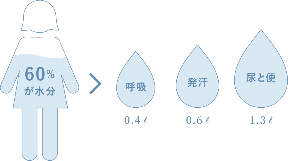 人の体の約60%は水分と言われていますが、そのなかで人が1日に排出する水は合計約2.3Lと考えられています。
