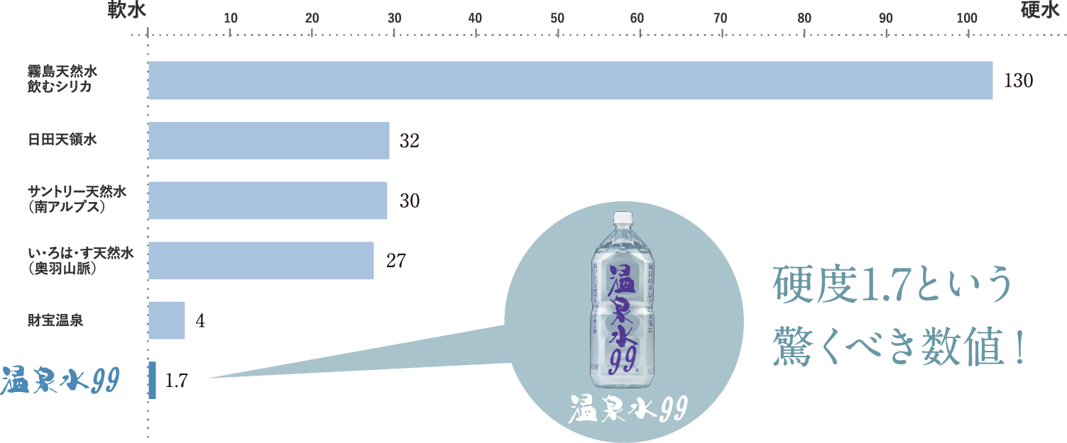 日本のほとんどの水は、硬度20~100の軟水のため世界的にもおいしいと評価されています。 その中でも「温泉水99」は硬度2以下という『桁違いの軟水』。