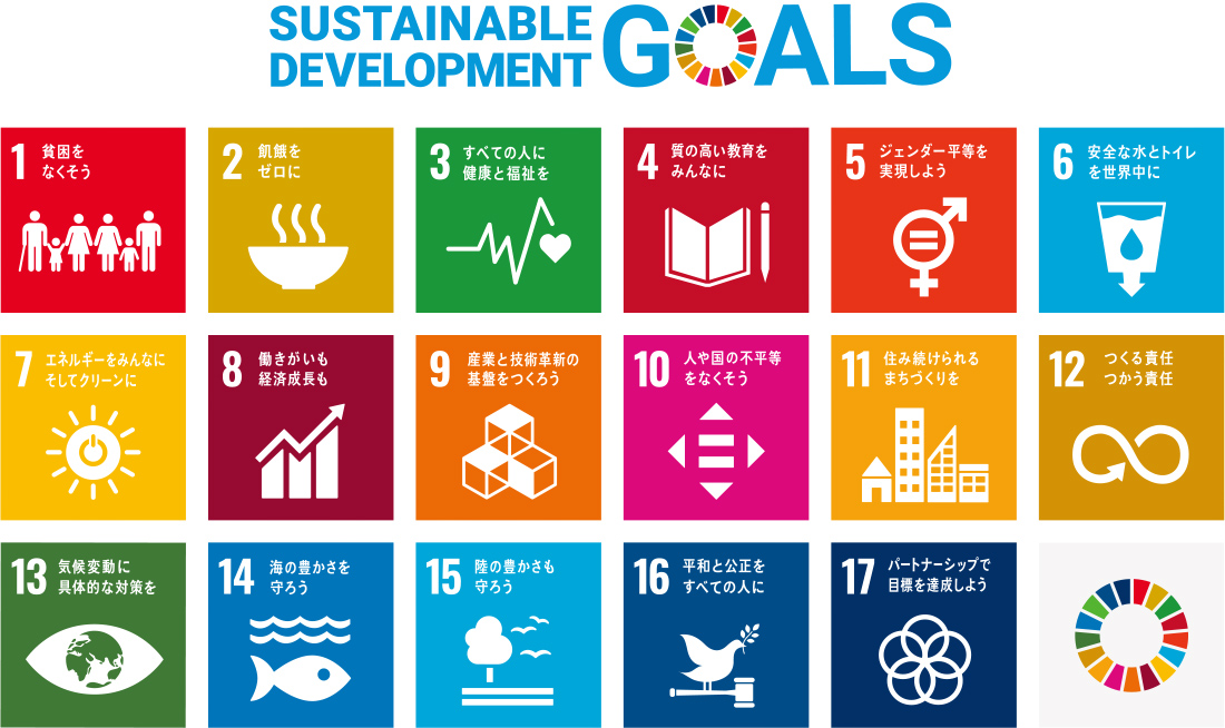 「Sustainable Development Goals(持続可能な開発⽬標)」の略称で、2015年9⽉に国連で採択された2030年までに達成すべき国際⽬標です。 「誰⼀⼈取り残さない」をスローガンに、貧困、気候変動、⼈種、性差別、働き⽅などの社会が抱える様々な問題を解決し、世界全体で明るい未来を⽬指すための17のゴールと169のターゲットで構成されています。