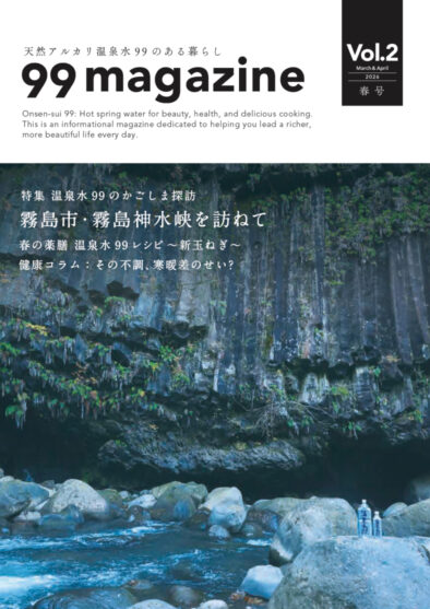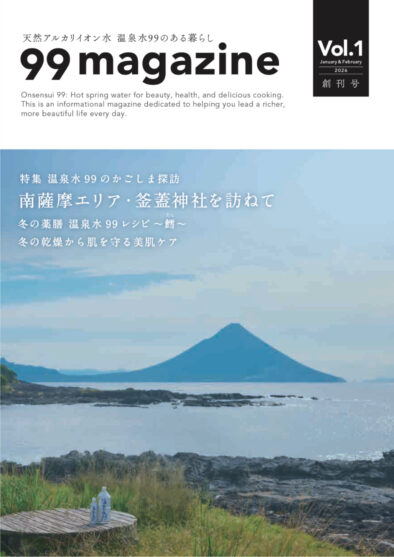 情報誌『99 magazine』 情報誌『99 magazine』 温泉水99のふるさと・鹿児島を舞台に、土地の恵みや温泉文化、暮らしの知恵をお届けする隔月発行の情報誌です。 鹿児島各地を訪ねる探訪企画や温泉めぐり、温泉水99を使ったレシピ、美容・健康にまつわるコラム、お客様のお声、メディア掲載情報などを掲載。日々の暮らしにそっと寄り添いながら、鹿児島の魅力と、温泉水99のある心地よい時間をご紹介します。 霧島エリア・霧島神水峡を訪ねて Vol.2(2026年3月・4月号) 霧島エリア・霧島神水峡を訪ねてダウンロード 南薩摩エリア・釜蓋神社を訪ねて Vol.1(2026年1月・2月号) 南薩摩エリア・釜蓋神社を訪ねてダウンロード