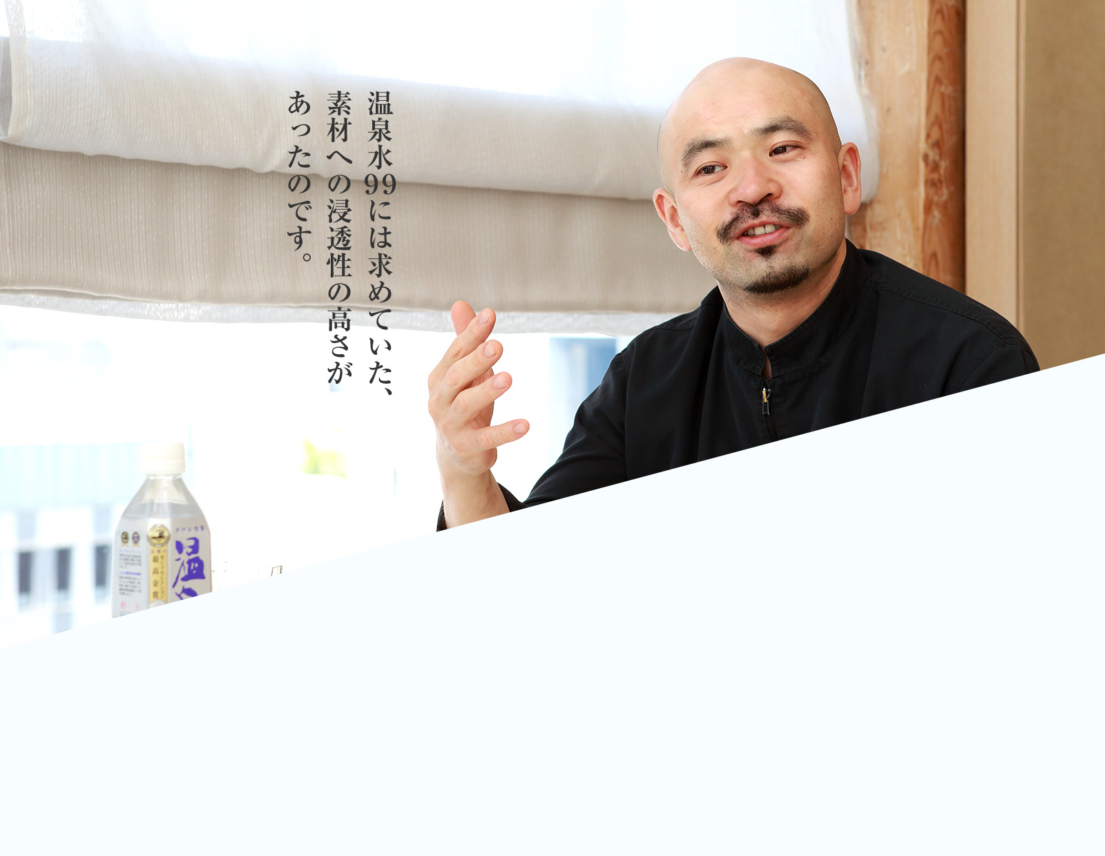 塩水を作るときに使います。魚の脱水をするためです。魚は普通、塩を振って焼くじゃないですか。そうやると、魚の水分がでてきますが、同時に臭いも出てきます。その臭いをどう取ればいいのか。そう考えて、僕は塩水に一定の時間浸けて、それから焼くんです。浸けた魚が同じ味に仕上るメリットもあります。そして、塩分濃度を上げた水に魚を浸けると、水分を出しつつ、臭いも洗い流されます。温泉水99は水の粒子が細かいので、魚の中に入りやすいし、逆に魚の中の水分も出やすいのです。