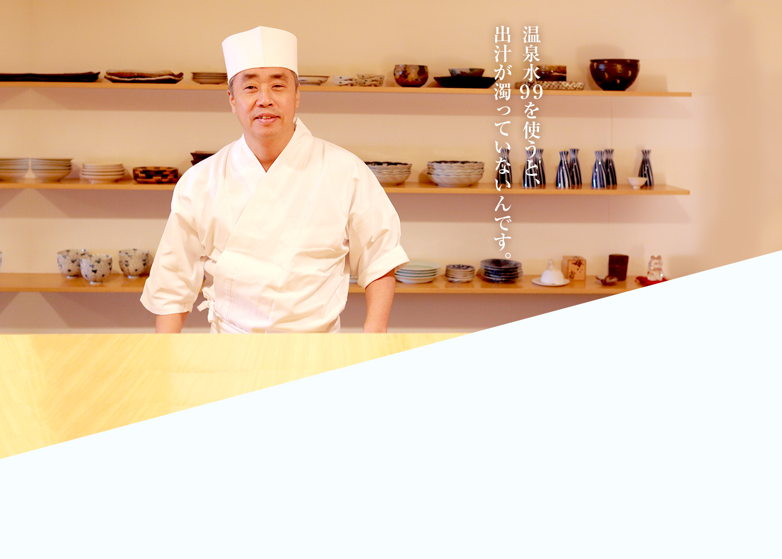 いろんな水を試しているんですけど、今は温泉水99に落ち着いています。簡単に言うと、温泉水99を使うと出汁が濁っていないんです。うちが使用している昆布との相性がいいのです。もちろん、一概にすべての昆布で言えることではないですが、今うちが使っている昆布と相性がいいのは事実ですね。いろんな水を試した結果、そういう事実だったので、温泉水99を使っているという訳です。